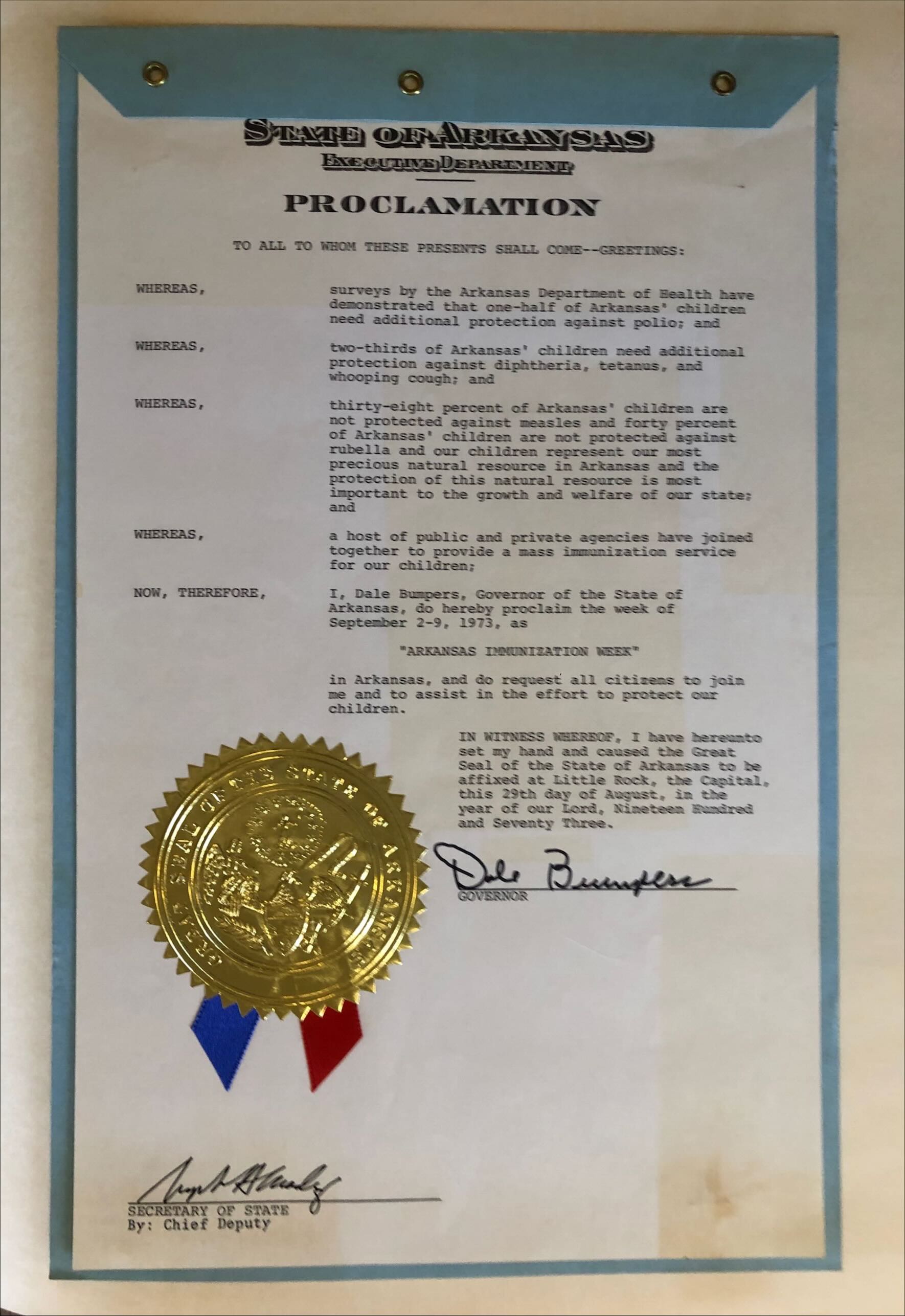 "State of Arkansas Proclamation: Arkansas Immunization Week," 20 Aug. 1973, The University of Arkansas Archives.