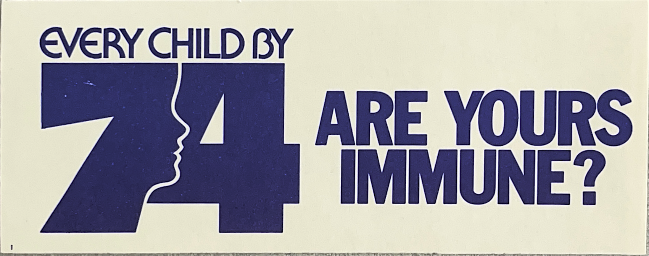 "Every Child By 74: Are Yours Immune?" 1974, bumper sticker, The Butler Center.