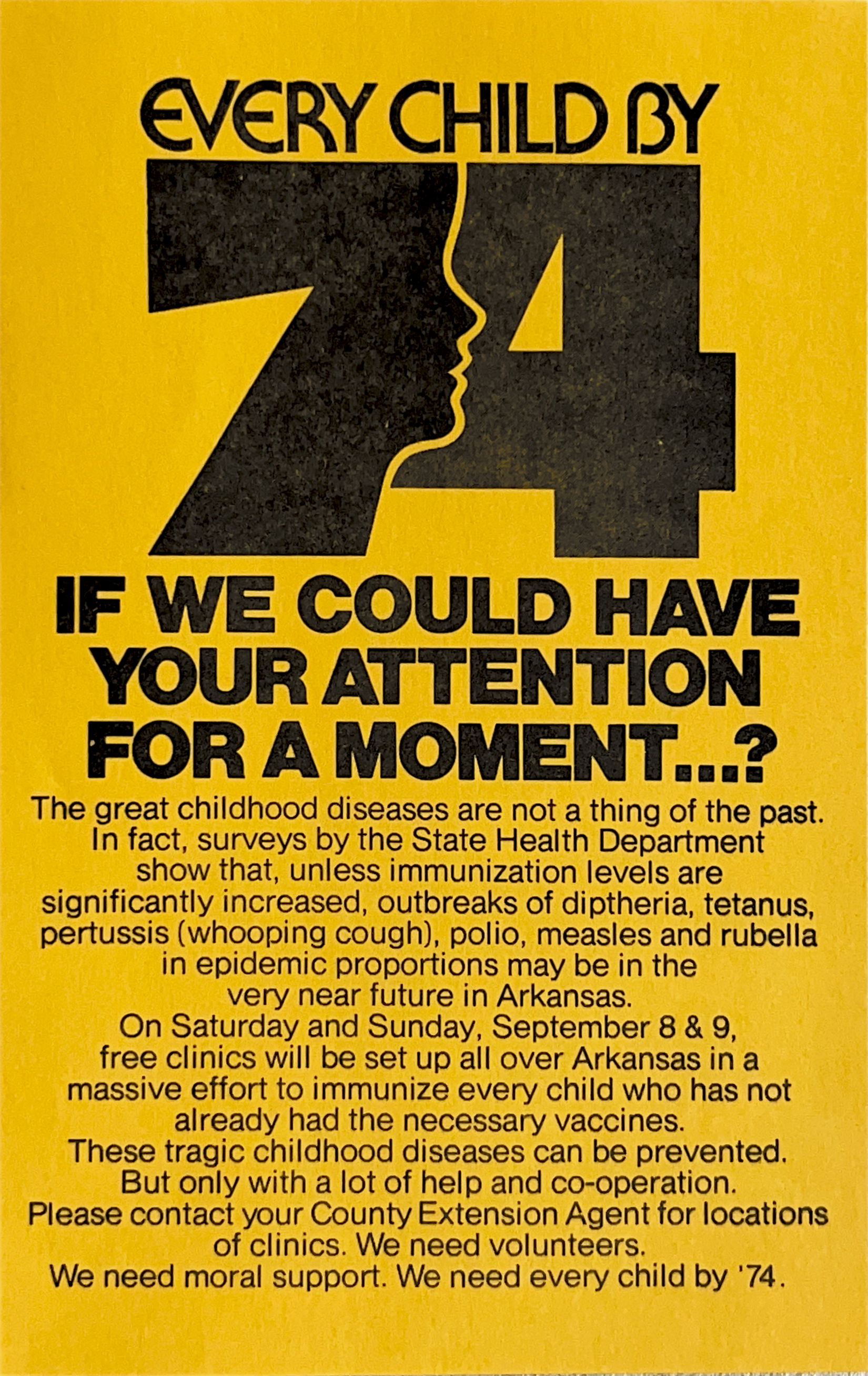 “We are on the verge of an epidemic of communicable diseases in Arkansas with already significant outbreaks of measles and rubella during 1973. In the face of this distressing news is the fact that at least one-half of the children in our state between the ages of six months and 11 years are not fully immunized. Even worse, according to State Health Department officials, four out of five two-year-olds have not had all of the recommended doses.”